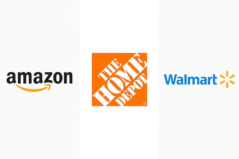 %Logos of Amazon, Home Depot, and Walmart side-by-side
